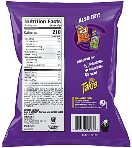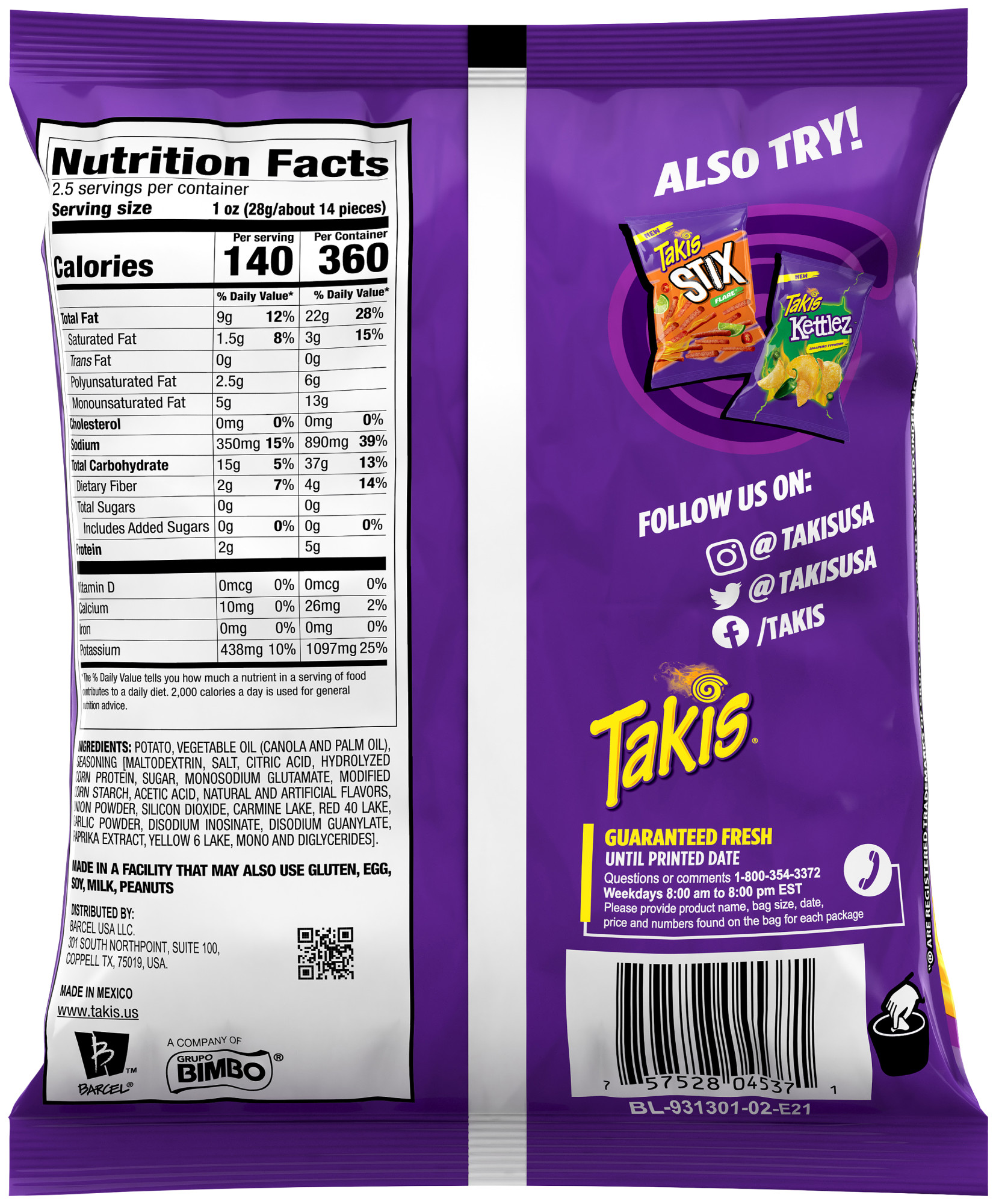 I was at my nephews birthday party and i was hanging out with the kids and they made up some taki challenge me being as stupid as i am i tried to eat more takis than all the kids. How Many Takis Are In A Bag Calories. As all mexican brithday parties go.